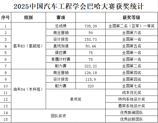 近日,2025中国汽车工程学会巴哈(越野车)大赛在浙江湖州落幕。本次赛事吸引全国115支车队、近2000名学子同台竞技,我校汽车智能制造学院飞翼车队携氢能巴哈赛车H3、燃油巴哈赛车U4参赛,最终斩获氢能组全国总成绩亚军(一等奖)、燃油组二等奖的优异成绩。