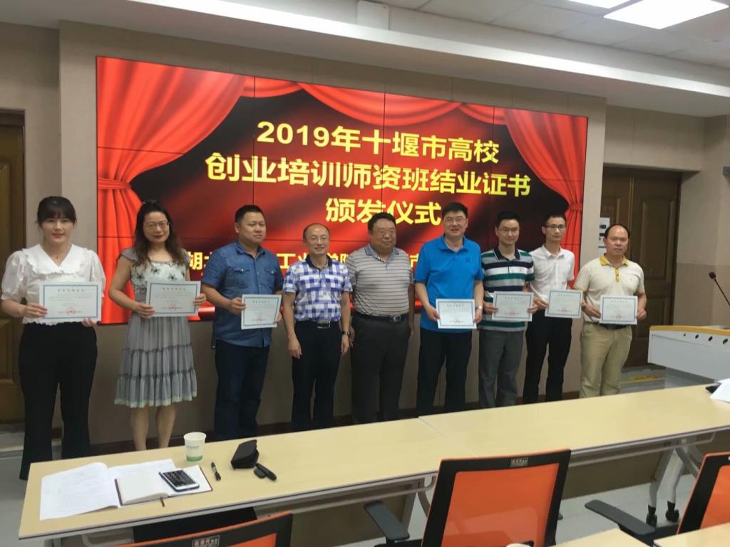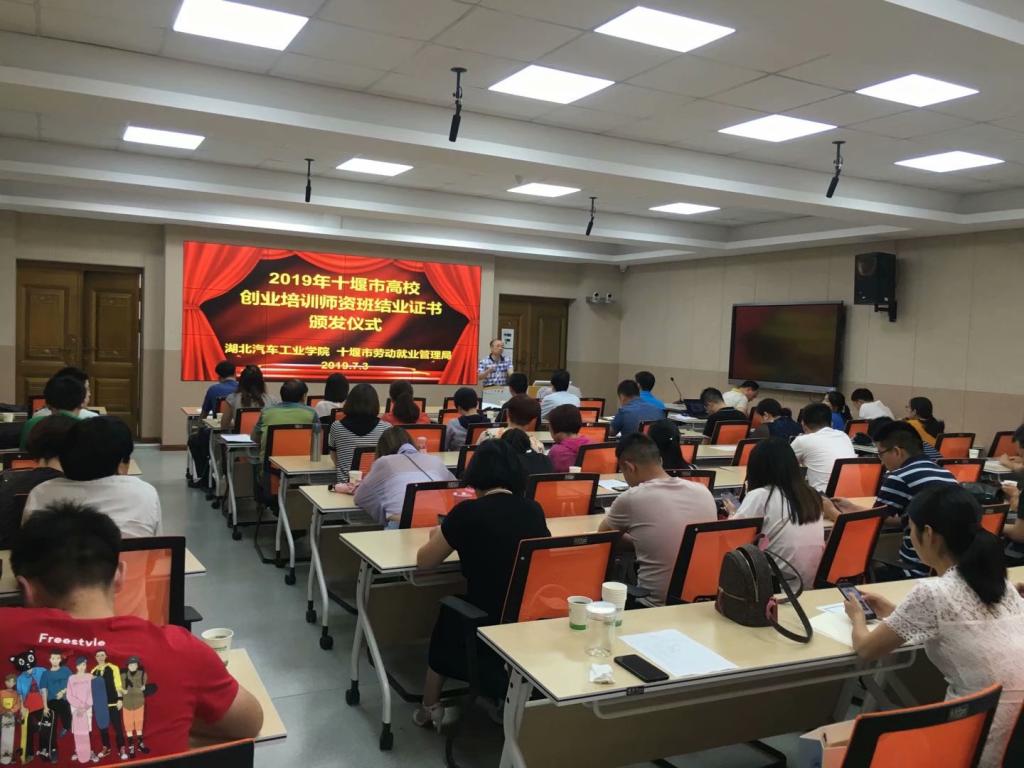 2019年7月3日下午2:30,由我校与十堰市劳动就业训练中心联合举办的2019年十堰市高校创业培训师资培训班结业证书颁奖仪式既SYB开课前部署工作在我校1305报告厅举行。副校长张友兵、十堰市劳动就业训练中心主任陈少军、工会主席张强、全体参训学员参加了颁奖仪式既SYB开课前的部署工作。颁奖仪式由william威廉中文院长缪勇主持。