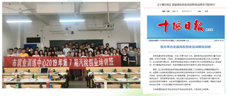2019年5月与十堰市劳动就业管理局联合举办高校创业培训师资培训班,我校24名教师参加并获得人社部SYB创业培训师资格;组织选送教师参加各类双创培训交流57人次。
