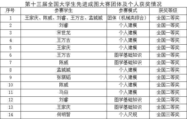 11.28日从“高教杯”全国大学生先进成图技术与产品信息建模创新大赛组委会传来喜讯,在第十三届“高教杯”全国大学生先进成图技术与产品信息建模创新大赛中我校学子获国奖13项,学校代表队荣获机械类团体二等奖。因疫情影响,此次大赛首次采用线上形式举行,在机械学院工程图学部专家指导团队的精心组织下,我校经两轮选拔后共选出9名同学参加国赛,经激烈角逐,参赛队最终荣获机械类团体二等奖(全国总第52名),参赛队员获个人一等奖6项、二等奖6项、三等奖1项,王永泉、曹占龙、金晶、何理分别荣获优秀指导教师二等奖。本届大赛吸引了来自全国30个省、395所高校的647支队伍参加,其中985、211或“双一流”高校超百所,参赛师生近7000余人。