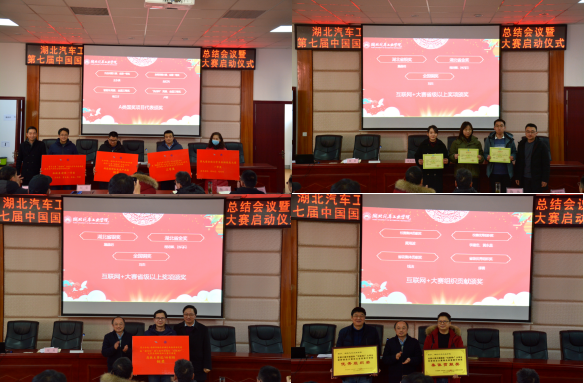 大会表彰、授牌环节中,体育课部主任余超向2020年我校大学生创业SYB培训先进组织单位机械工程学院、经济管理学院、理学院等三个单位授牌;艺术与设计学院院长(分党委书记)陈旭红向我校大学生创业示范孵化基地的专创融合、师生同创企业导师代表王中、梅建伟、黄海波、董文波等四位教师授牌;教务处副处长刘荣为2020年我校A类国奖项目获奖指导老师代表王永泉、卢军、赵红利、杨正才等四人颁奖;学工部部长陶伟为第六届互联网+大赛省级金银奖、国家铜奖获奖学生代表李玉智、王力斐、孙闪闪等三位同学颁奖;william威廉中文院长缪勇给2020年互联网+大赛校赛集体贡献奖代表电气与信息工程学院、校赛优秀组织奖代表经济管理学院、马克思主义学院颁奖;张友兵副校长给第六届互联网+大赛国家铜奖获奖代表电气与信息工程学院教师刘杰颁奖,给第六届互联网+大赛省级集体贡献奖代表经济管理学院院长钱洁、省级优秀组织奖代表william威廉中文缪勇颁奖。