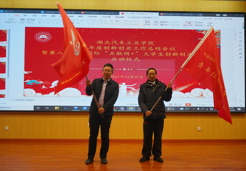 首先,缪勇作2021年度全校创新创业工作总结。缪勇指出,在全校师生的共同努力拼搏下,我校创新创业竞赛成绩取得历史性突破。学科竞赛共获省级及以上奖项430项,国家级奖项170项,A类竞赛国家级奖项57项,关键指标“A类国赛获奖数”超额完成学校下达的挑战目标(挑战目标40项)。第七届中国国际“互联网+”大学生创新创业大赛中我校喜获全国铜奖4项,省赛金奖4项、银奖1项、铜奖3项。省赛金奖排位赛综合成绩我校位列全省高校(含985、211)第7,省属本科高校排名第3,均取得历史性突破,学校被湖北省教育厅授予互联网+大赛“优秀组织单位”和“集体贡献奖单位”称号。大学生创新创业训练计划项目获批国家级项目20项、省级60项,校级立项31项;结题67项,学生公开发表论文66篇,获批专利1项,立项率和结题率再创新高;建立创业培训师资库,举办第二期全省“SYB创业培训师资”培训班,我校24名教师参训合格取得创业培训讲师资格。组织2021年SYB大学生创业培训,共有18级学生2257人参加培训,培训合格率超过92%;牵头完成教育部“创业管理”本科新专业申报工作并通过省教育厅专家评审;积极引入资源,扩大双创圈,打造十堰双创新高地,形成双创资源共享、双创课程互认、双创平台共建共用局面。2021年学校获批湖北省发改委省级双创示范基地(储备基地)、湖北省人社厅大学生创业孵化示范基地(A级)等平台称号,牵头成立“十堰市高校创新创业教育联盟”并成功举办十堰市首届创新创业高峰论坛,举办“东风梦想车”赛事,与东风公司创业基金会、东风商用车公司等共建校企联合众创空间;双创实践平台建设取得重要进展;积极争取各类资源,截止12月15日实现创收金额达200万元,人均创收40余万元;我校大学生创新创业俱乐部被评为“全国高校十佳创业社团”。我校2名学生分别获得湖北省教育厅“长江学子创新奖”、“长江学子创业奖”,1名学生获得十堰市“十佳创业青年”。