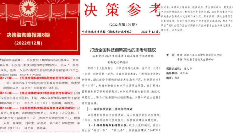 本次决策咨询成果获省领导签批,鼓舞了人心,激发了我校教师开展科技创新研究的热情,为湖北打造全国科技创新高地贡献高校教育工作者的智慧,向我校建校50周年校庆献礼。