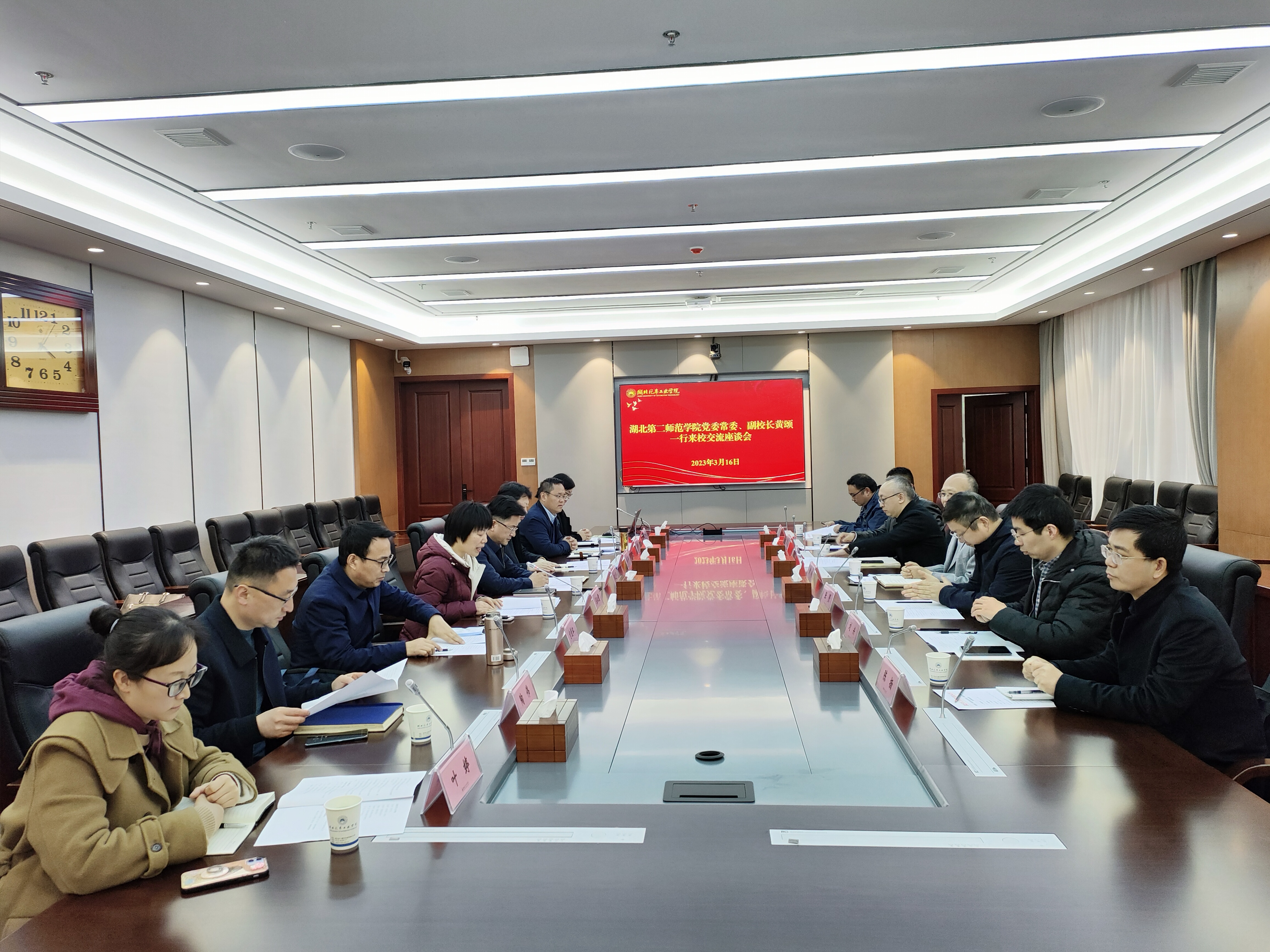 3月16日下午,湖北第二师范学院党委常委、副校长黄颂一行7人来校调研交流。我校党委书记张文学,党委常委、副校长张红霞热情接待,并在产教大楼三楼多功能会议室召开座谈交流会。座谈由张红霞主持。