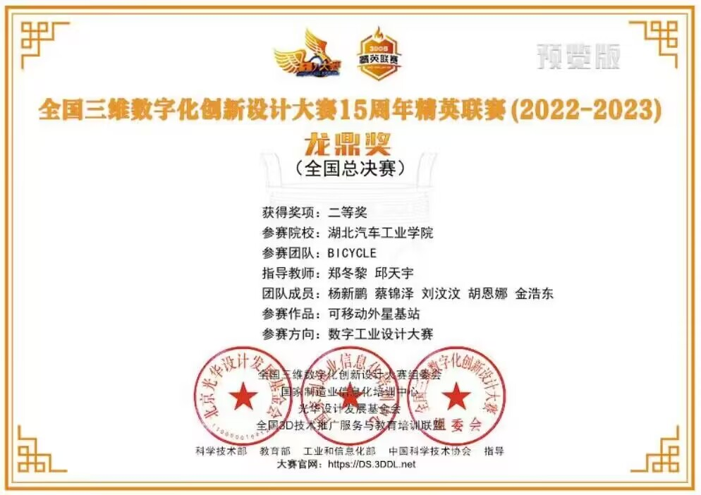 汽车工程学院BICYCLE团队作品“可移动外星基站”在全国三维数字化创新设计大赛精英联赛(2022-2023)全国总决赛中获二等奖1项。