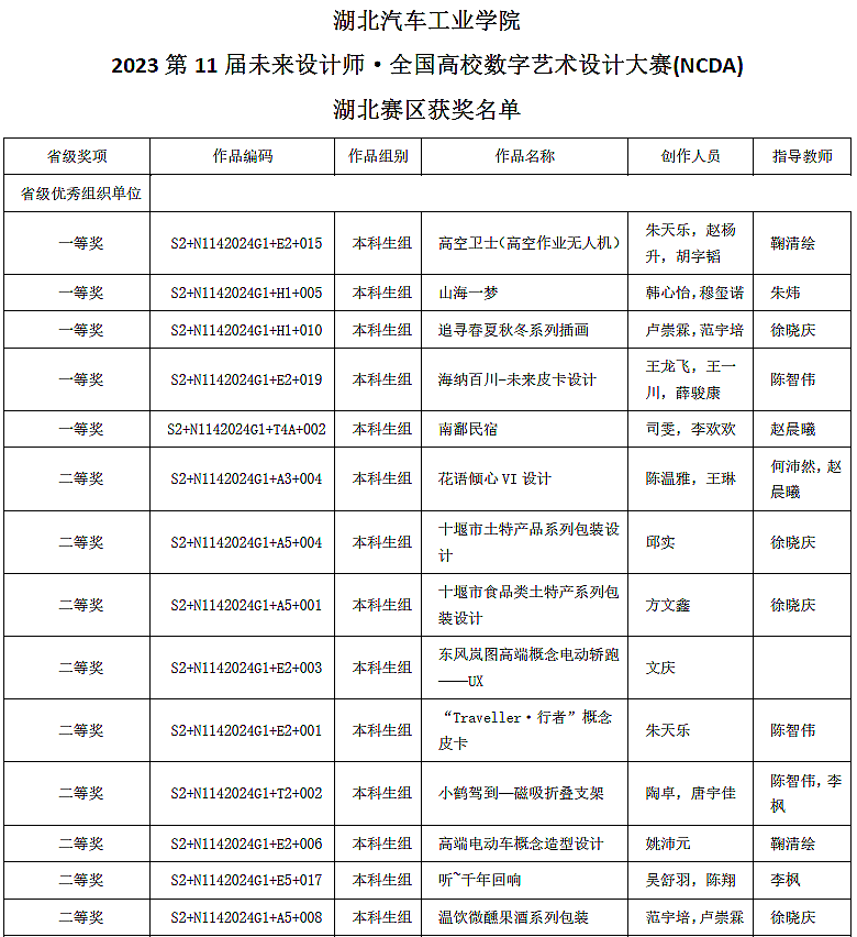 艺术与设计学院在米兰设计周中国高校设计学科师生优秀作品展中斩获国家级奖项5项,省级奖项8项;在第11届未来设计师·全国高校数字艺术设计大赛湖北赛区获一等奖5项、二等奖10项、三等奖21项,学校获得优秀组织单位。