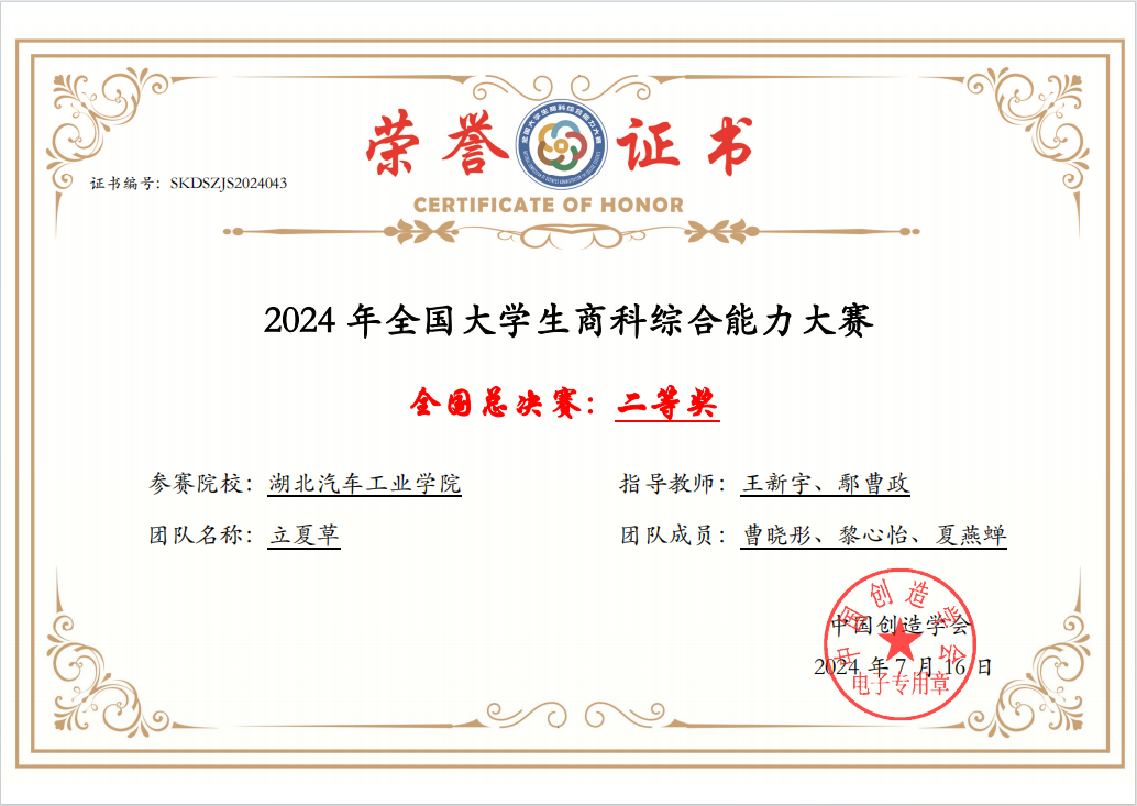 近日,由中国创造学会主办,中南大学商学院、上海策鸿信息科技有限公司、中国创造学会青年工作委员会承办的2024年全国大学生商科综合能力大赛全国总决赛在湖南长沙中南大学成功举办。WilliamHill中文代表队,由王新宇、鄢曹政老师指导,物流管理系曹晓彤、黎心怡、夏燕蝉三位同学组成,经过激烈的企业经营虚拟仿真竞赛,凭借出色的表现和团队协作,荣获全国二等奖。
