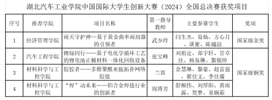 中国国际大学生创新大赛(2024)由教育部、中央统战部、中央网信办、国家发改委、工信部、人社部等12个部门会同上海市人民政府主办。来自国内外153个国家和地区的5000多所院校、500余万个项目、2000多万人次报名参赛。历经五个月的层层角逐,1410个项目入围总决赛。在7月份举行的省赛中,我校获得湖北省金奖5项,银奖4项,铜奖6项,4个项目入围国赛总决赛。
