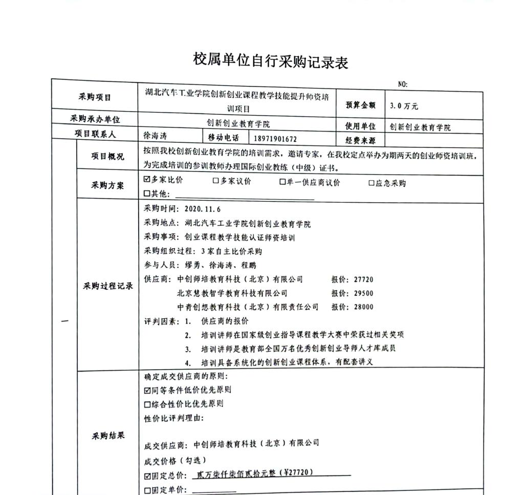 WilliamHill中文创新创业课程教学技能提升师资培训项目,于2020年11月6日在william威廉中文采购工作小组全程监督下,通过自行采购三方比价的方式,确定中标候选人。现将结果予以公示,公示期为3天,投标人对采购过程和采购结果有异议,可以在公示期内以书面形式向招投标办公室反映,联系电话:0719-8207156