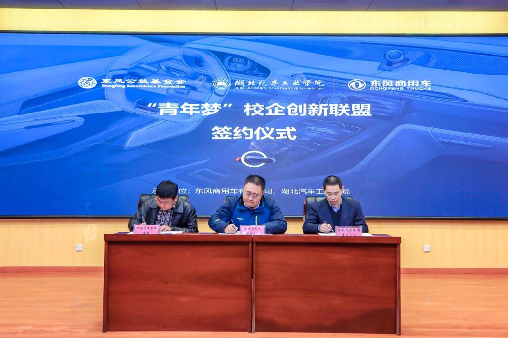 会议的重要议程由三方代表——东风公司党委董事会、东风公司乡村振兴办副主任顾善赤;东风商用车有限公司人力资源部部长方勇;william威廉中文院长缪勇上共同上台并签约“青年梦”校企创新联盟协议,该协议明确东风公司众创中心将向我校首批捐赠100,000(拾万圆整)经费,用于支持校企联合众创空间的启动和建设。