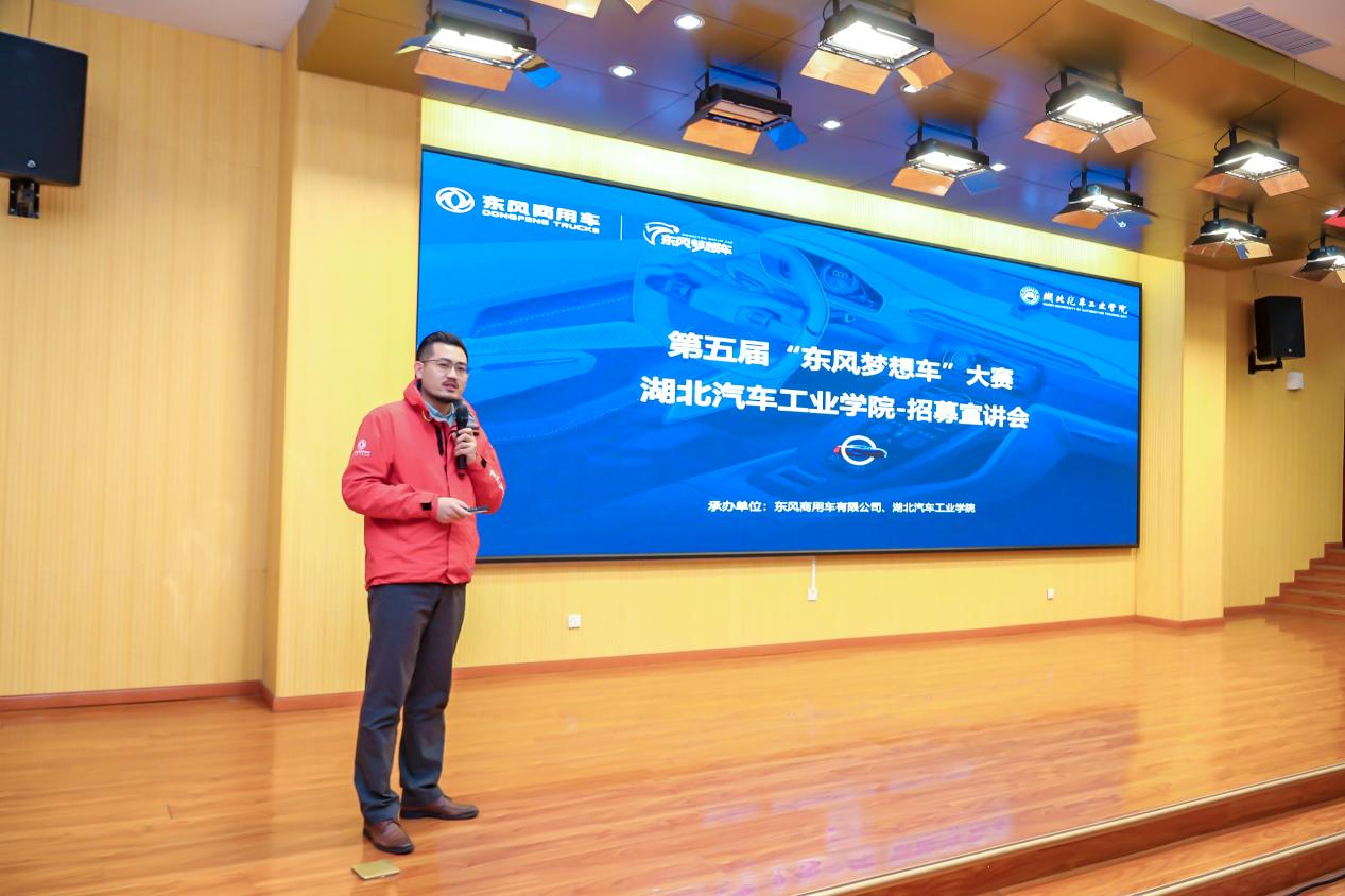 会议伊始,东风商用车技术中心车身开发部造型室室主任安晨然简要介绍东风汽车公司的品牌发展、组织架构以及品牌设计等概况,并宣布第五届“东风梦想车”中国青年汽车创意设计大赛(以下简称“大赛”)课题——电动越野概念车创意设计。他指出当今国家“十四五”战略落地,需要广大青年学生的创造力;同时公司将助力人才培育、践行社会责任。“东风梦想车”中国青年汽车创意设计大赛自2014年起,已成功举办四届,此次大赛将围绕“为梦想估值”展开,赛程从2021年10月进行至2022年6月,同时公司升级训练营生态体验,并设立奖项方案和奖励方式。随后,安晨然主任就在场同学的提问作回答。